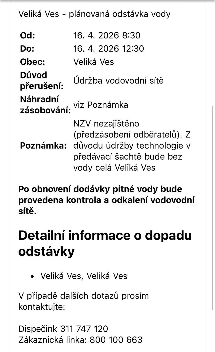 Odstávka vody - 16. 4. | Obec Veliká Ves