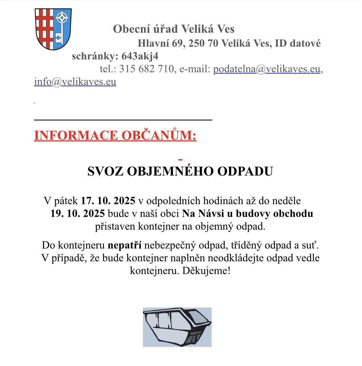 Svoz objemného odpadu - 17. 10. 2025 | Obec Veliká Ves