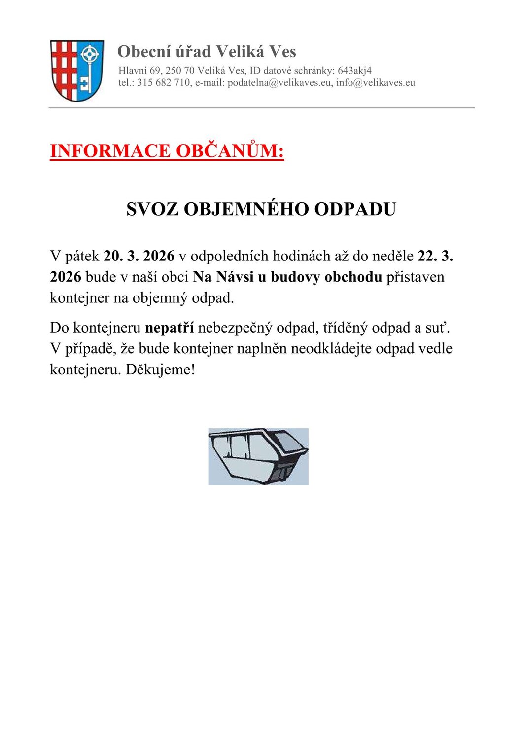 Velkoobjemový kontejner - 20.3.-22.3. | Obec Veliká Ves